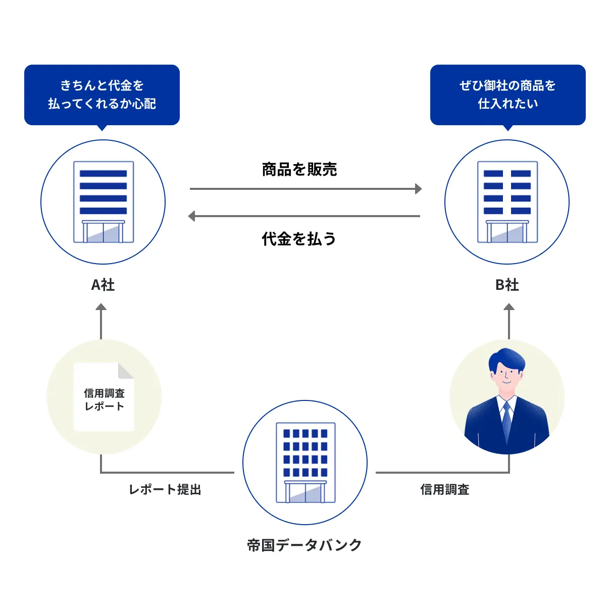 現在、行われている商取引の多くは信用取引(与信取引)です。代金の後払いを基本とする信用取引では、取引前に相手の信用を見極めることが重要となります。代金回収のリスクを少しでも減らすため、支払い能力はあるか、債務超過に陥っていないか…など、取引を判断するためには信用情報が必要となります。