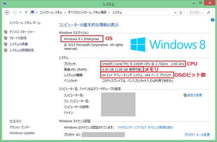 上図の場合、OSはWindows8.1 の64ビット版、CPUは2.8GHz、メモリは4GBとなります。