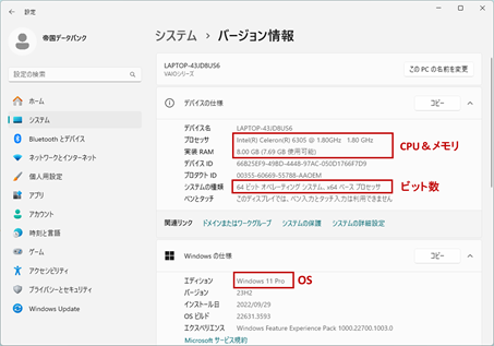 上図の場合、OSはWindows11 Proの64ビット版、CPUは1.8GHz、メモリは8GBとなります。