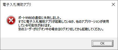 1. 電子入札補助アプリを重複起動した際も当エラーメッセージが表示されます。