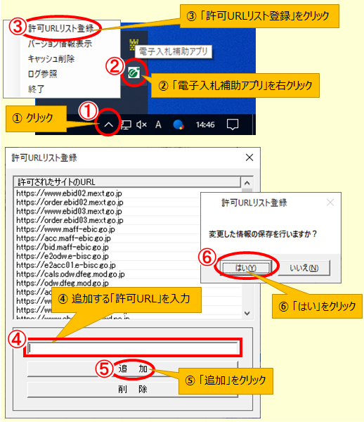 電子入札システムにアクセスした際に上記の確認メッセージが表示された場合は「許可」を選択するようにしてください。