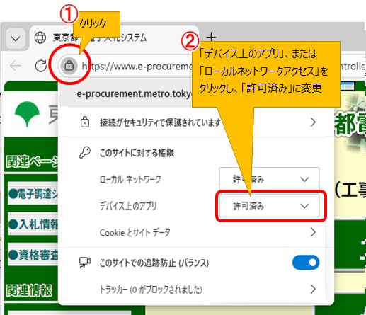 電子入札システムにアクセスした際に上記の確認メッセージが表示された場合は「許可」を選択するようにしてください。