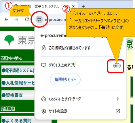 「デバイス上のアプリ」(または、ローカルネットワークアクセス)を「許可済み」に設定を変更し、ブラウザを再起動してください。