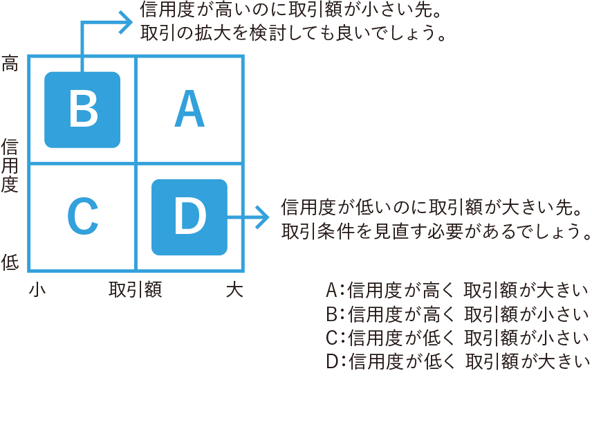 当社の取引先は1000社以上あり、全てを詳細に把握することは容易ではありません。 帝国データバンクのデータベースを利用して、取引を拡大すべきターゲットやリスクの高い取引先の状況を可視化し、リスク管理の精度向上と営業・マーケティング戦略の策定に役立てています。 会社全体として、どの分野・事業に力を注いでいくか、またリスクをどのようにして分散させていくかといった営業戦略を策定する際、まずは取引先の全体像の把握から始めます。しかし、自社の情報だけではそれらを整理することは困難なため、帝国データバンクのデータベースを利用し、得意先や仕入先情報の整理・分析を行っています。 具体的には、自社の「取引実績」と帝国データバンクの調査に基づく「評点」の関係がマトリクス分布図化、分析されたレポートを入手しています。取引額が大きいにも関わらず信用程度が低い企業群は、リスク管理として調査報告書を定期的に入手しています。一方、取引額が小さく信用程度が高い企業群も一目でわかるため、今後営業面で注力すべき企業群は社内で情報を共有、特にアプローチする企業群として取引額の増加に向けて提案内容を強化しています。 以前は、全社の取引状況を一元管理していくことは難しく、情報を整理していくことだけで、多くの時間を割いていました。現在では、帝国データバンクの企業情報や分析レポートによって作業が効率化されるとともに、自社で収集した情報も付け合せることによってリスク管理の精度があがったと感じています。また、潜在的な優良顧客に的を絞った営業強化策など様々な施策を実施できるようになりました。