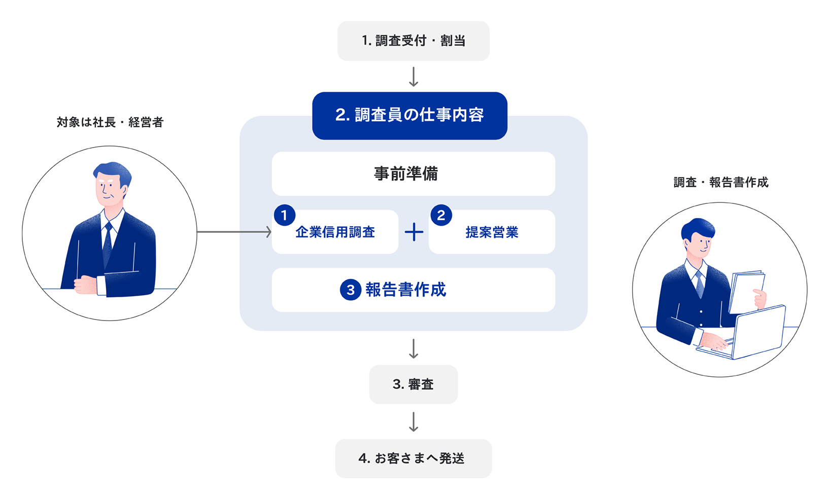 帝国データバンクの基幹事業である信用調査を担う調査営業職(通称:調査員)は、 人々の信頼を築くために不可欠な存在となっています。