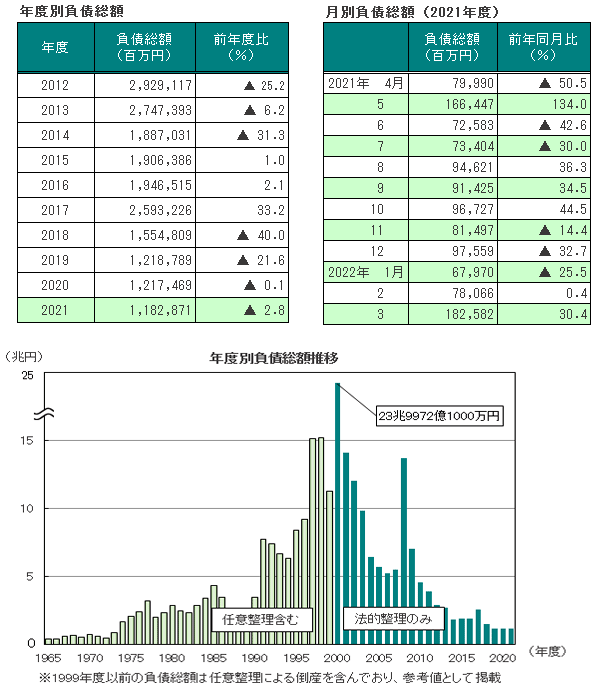 2021年度の負債総額は1兆1828億7100万円(前年度1兆2174億6900万円、2.8%減)と、345億9800万円減少。4年連続で前年度を下回り、2000年度以降最小だった前年度をさらに下回った。また月別では、12カ月中6カ月で増加、残り6カ月で減少した。