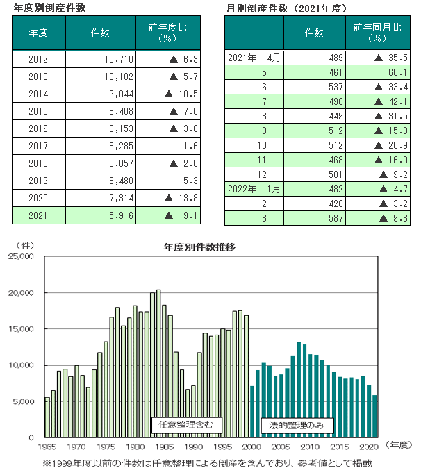 • ■2021年度の倒産件数は5916件(前年度7314件、19.1%減)と、1965年度(5593件)に次ぐ過去2番目の低水準となったほか、半世紀ぶりの6000件割れを記録