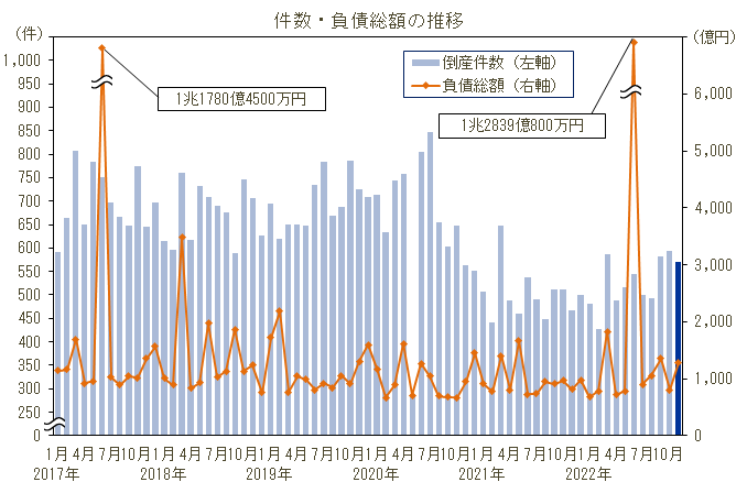 2022年11月の企業倒産は570件発生し、今年最多を記録した前月(594件)をわずかに下回ったものの、前年同月(468件)を102件上回って7カ月連続の前年同月比増加となった。前年同月から100件以上増加したのは、11月単月としてはリーマン・ショック発生直後の2008年以来14年ぶりとなる。コロナ禍による企業活動の停滞以外の理由、円安・物価高・人手不足の「三重苦」が最後の追い打ちとなった中小企業の倒産が相次いでいることが要因で、特に物価高(インフレ)倒産は前月を大幅に上回る46件が発生し、5カ月連続で過去最多を更新した。コロナ融資など各種金融支援による倒産抑制効果は、前年に比べて弱まりもみられる。