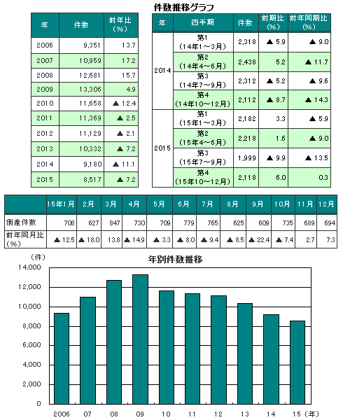 2015年の倒産件数は8517件(前年9180件、前年比7.2%減)と、6年連続で前年を下回り、2005年(8225件)以来、10年ぶりに9000件を下回った。四半期ベースでみると、第3四半期まで一貫して減少基調で推移していたものの、第4四半期は、2013年第2四半期以来、10四半期ぶりの前年同期比増加に転じた。