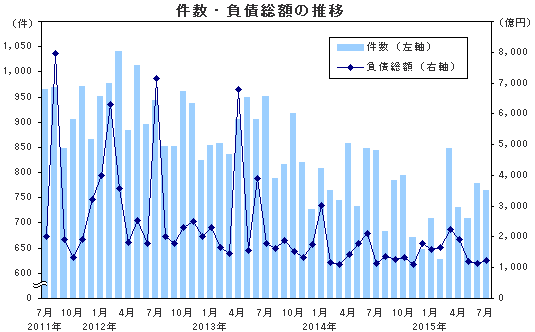 倒産件数は765件で、前年同月比9.4%の減少となり、4カ月連続で前年同月を下回った。同減少率は3カ月連続で1ケタ台にとどまっている。負債総額は1241億5700万円、前年同月比7.7%の増加で、3カ月ぶりに前年同月比増加となった。