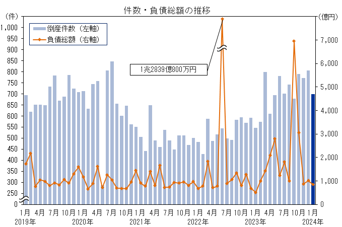 2024年1月の企業倒産は700件発生し、前年同月(546件)を28.2%(154件)上回った。2022年5月から21カ月連続で前年同月を上回り、1月としては2019年(713件)以来4年ぶりに700件台となった。中小・零細企業を中心に、物価高や人手不足、コロナ支援策縮小の影響を受けた倒産が目立ち、「ゼロゼロ融資後倒産」が引き続き高水準で推移した。