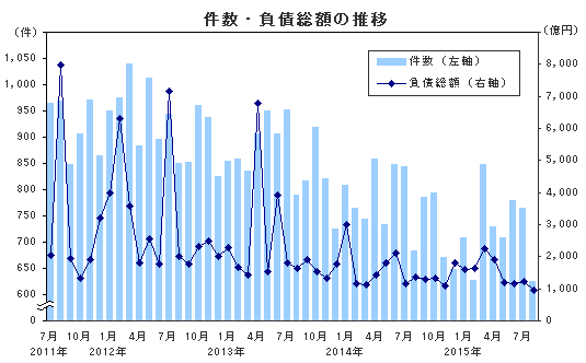 • ■負債総額は964億8500万円となり、前年同月比29.9%の減少で、2000年以降初めて1000億円を割り込み、最小記録となった
