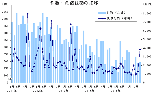 負債総額は3855億9300万円、2015年最大を記録