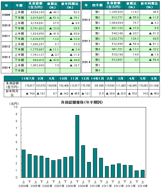 2014年上半期の負債総額は1兆638億8000万円と、2013年上半期の1兆7631億2700万円に比べ39.7%減少し、上半期としては2年連続で前年同期を下回った。四半期別では4期連続の前年同期比減少となり、月別では上半期6ヵ月中4ヵ月が前年同月比減少となった。
