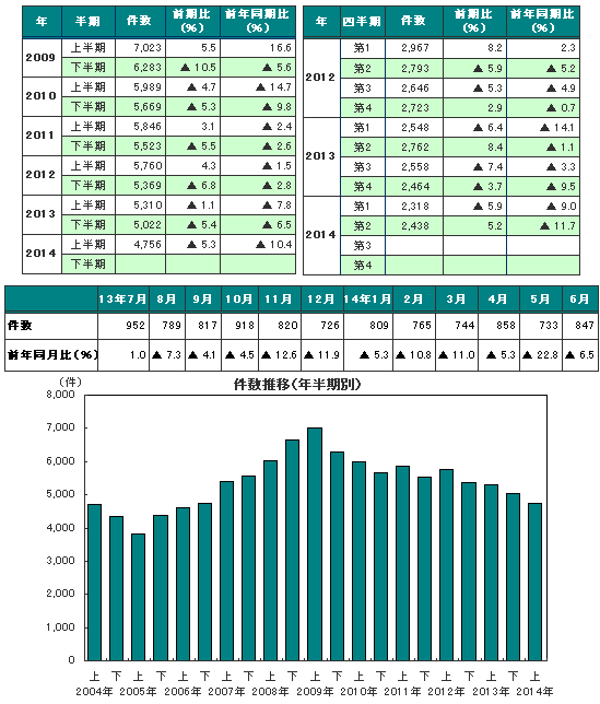 2014年上半期の倒産件数は4756件と、2013年上半期の5310件に比べ10.4%減少、5年連続で前年同期を下回り、リーマン・ショック前の水準となった。四半期別では9期連続の前年同期比減少、月別では上半期6ヵ月すべての月で前年同月比減少となった。