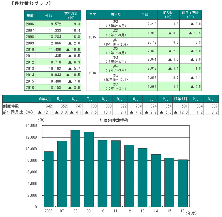 2016年の倒産件数は8164件(前年8517件、前年比4.1%減)と、7年連続で前年を下回った。2000年(6734件)に次ぐ過去2番目の低水準となったものの、前年比の減少幅は2年連続で縮小した。四半期ベースでみると、第3四半期は2018件(前年同期1999件)と微増したものの、それ以外の四半期で前年同期を下回った。