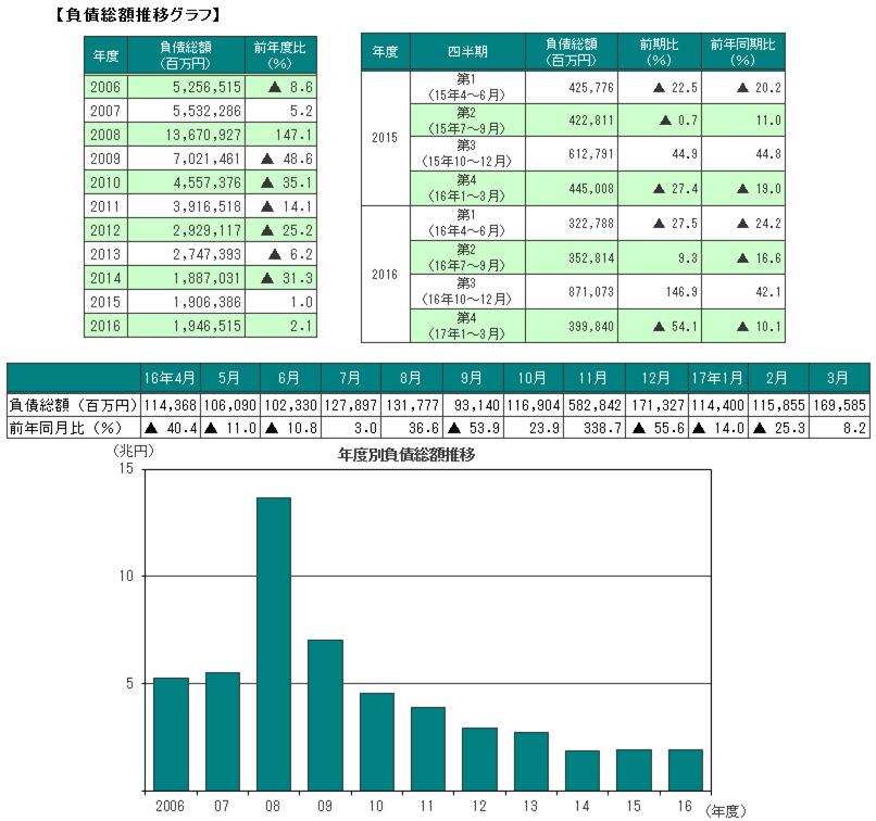 2016年の負債総額は1兆9916億8300万円(前年2兆108億800万円)と、前年を1.0%下回り、2年ぶりの前年比減少となった。四半期ベースでみると、第4四半期を除く3四半期で前年同期比2ケタの大幅減少。一方、第4四半期は、負債5000億円の大型倒産が発生したことで前年同期比では2ケタの大幅増加となった。
