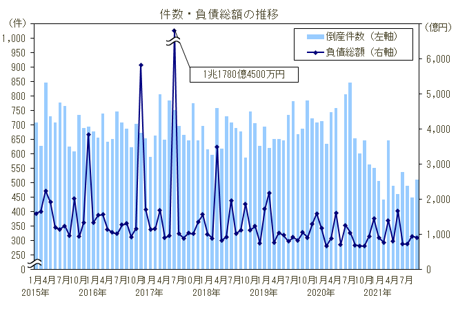 全国的な倒産傾向としては、微細な増減はあるものの今後も急激な増加はないだろう。4日に発足した岸田政権が、10月末に投開票が行われる衆議院総選挙の行方によるものの、金融支援を中心とした企業支援から経営不振企業に退場を促す内容へと大きく舵を切る事態は短期的に考えづらく、2021年後半にかけても倒産動向は比較的落ち着いた推移をみせるとみられる。