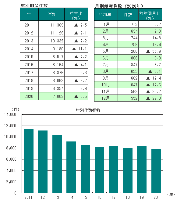• ■2020年の倒産件数は7809件(前年8354件、前年比6.5%減)と、2年ぶりに前年を下回り、2000年以降で2番目の低水準