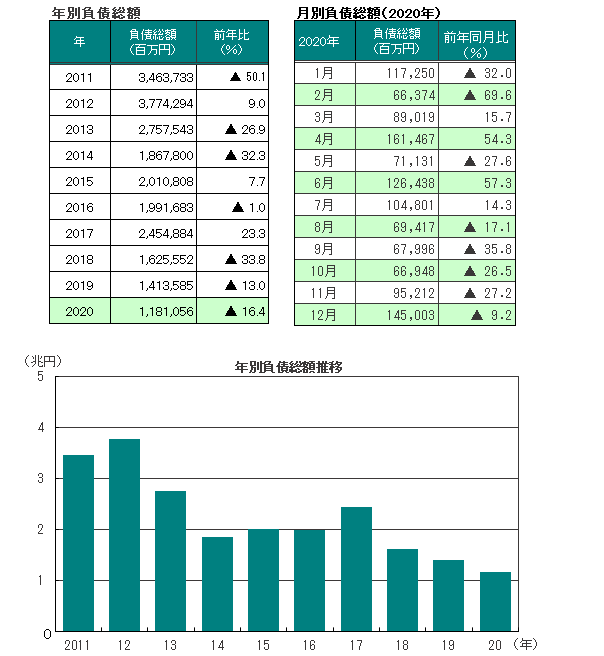 2020年の負債総額は1兆1810億5600万円(前年1兆4135億8500万円、前年比16.4%減)と最小だった前年をさらに下回り、2000年以降で最小となった。月別では、12カ月中8カ月で前年同月を下回った。