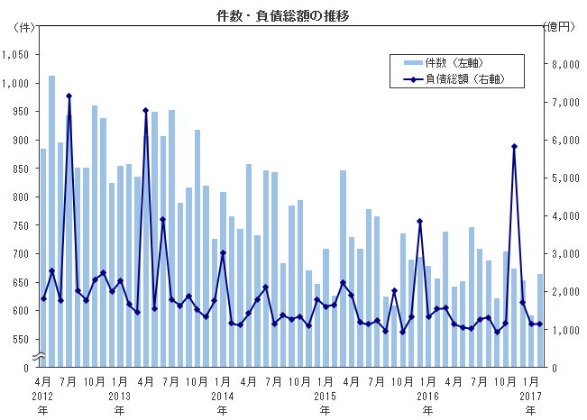 2017年2月の企業倒産件数は664件と前年同月(656件)を1.2%上回り、5カ月ぶりに増加した。負債総額は1158億5500万円と前年同月(1551億6800万円)を25.3%下回り、3カ月連続で減少した。負債5000万円未満の倒産が383件(構成比57.7%)となり、依然として小規模倒産が過半数を占める傾向が続いている。
