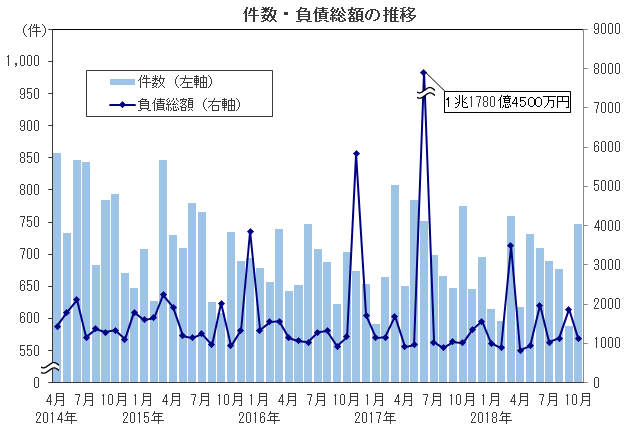 倒産件数は747件(前年同月比3.6%減)と、2カ月連続で前年同月を下回った。負債総額は1128億5600万円(同10.7%増)と、3カ月連続で前年同月を上回った。