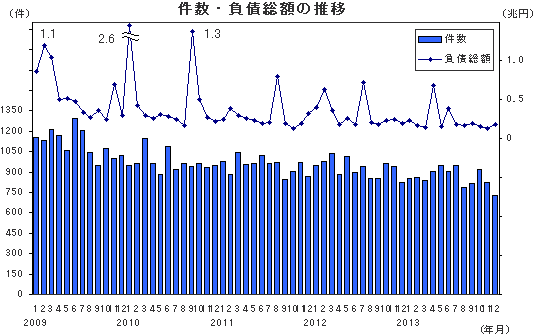 2013年の企業倒産は1万332件。2012年(1万1129件)を7.2%下回り、2010年以降4年連続の前年比減少を記録した。倒産件数が1万1000件を下回ったのは、リーマン・ショック前の2007年(1万959件)以来、6年ぶり。一方、負債総額は2兆7575億4300万円で、前年比26.9%の大幅減少となり、2000年以降で最小となった。負債1000億円以上の倒産が、カブトデコム(元建築工事・不動産業、負債5061億円、4月)、アイティーエム証券(証券業、同1416億円、6月)の2件にとどまったことで、負債総額は抑えられた。