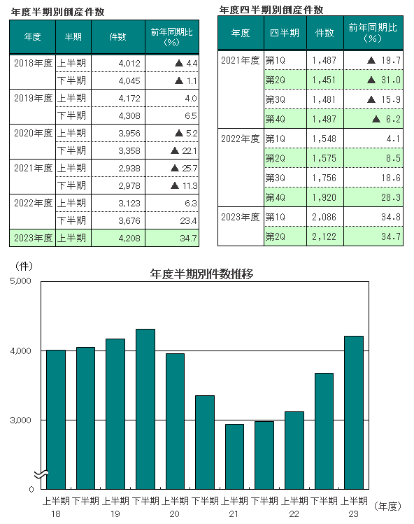 • ■2023年度上半期の倒産件数は4208件(前年同期3123件、34.7%増)と、上半期としては2年連続で前年を上回り、4年ぶりに4000件を超えた。前年同期を34.7%上回るなど、増加率(年度半期ベース)は2000年度以降で最も高くなった