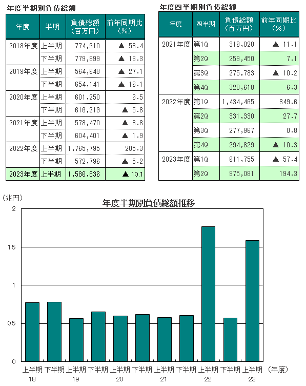 • ■負債総額は1兆5868億3600万円(前年同期1兆7657億9500万円、10.1%減)だった。前年同期から減少したものの、パナソニック液晶ディスプレイ㈱やユニゾホールディングス㈱など大型倒産が相次いだこともあり、上半期としては10年ぶりに2年連続で1兆円を超えた