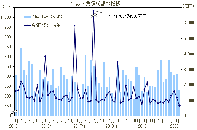 倒産件数は634件、6カ月連続の前年同月比増加
