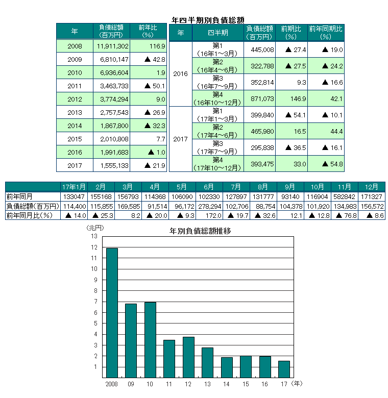 2017年の負債総額は1兆5551億3300万円(前年1兆9916億8300万円)、前年比21.9%減と、2年連続で前年を下回った。四半期別では、第2四半期を除く3四半期で前年同期比2ケタの減少となった。