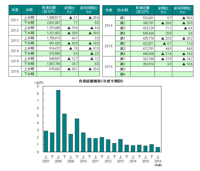 2016年度上半期の負債総額は6756億200万円(前年同期8485億8700万円)と、前年同期を20.4%下回り、2000年度以降最小を記録した。年度上半期では3年連続で負債総額1兆円を下回り、リーマン・ショックが発生した2008年度上半期(8兆4533億1800万円)の約13分の1の規模にとどまる。