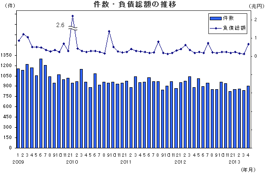 4月の負債額トップは、カブトデコム(株)(北海道、特別清算)の5061億円。以下、東海興業(株)(東京都、民事再生法)の140億5700万円、日本ウエブ印刷(株)(大阪府、民事再生法)の88億3000万円と続く。 負債1000億円以上の超大型倒産は2012年7月以来9ヵ月ぶり。