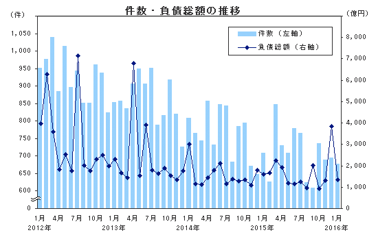倒産件数は678件で、前月比2.3%の減少、前年同月比でも4.2%減少となった。負債総額は1330億4700万円で、前月比65.5%の大幅減少となり、前年同月比でも16.9%の減少。件数、負債総額ともに前年同月比が減少したのは、2015年10月以来3カ月ぶり。