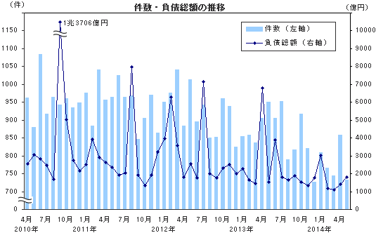 倒産件数は733件で、5月としては2006年5月(731件)以来の700件台を記録。前年同月比では22.8%の大幅減少となり、10ヵ月連続で前年同月を下回った。減少幅22.8%は2010年7月(23.8%)に次ぐ水準。負債総額は1790億8300万円で、前年同月比16.0%の増加となり4ヵ月ぶりに前年同月を上回った。