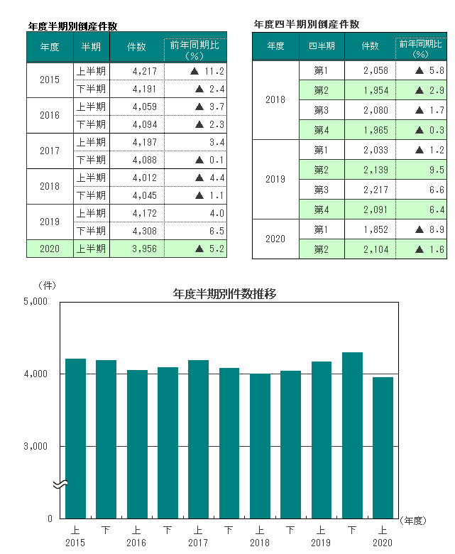 2020年度上半期の倒産件数は3956件(前年同期4172件)と、2年ぶりに前年同期を下回り、2004年度下半期以来の4000件割れとなった。また、上半期としては2000年度(3349件)に次ぐ、過去2番目に少ない件数となった。四半期別では、第1四半期、第2四半期ともに減少。