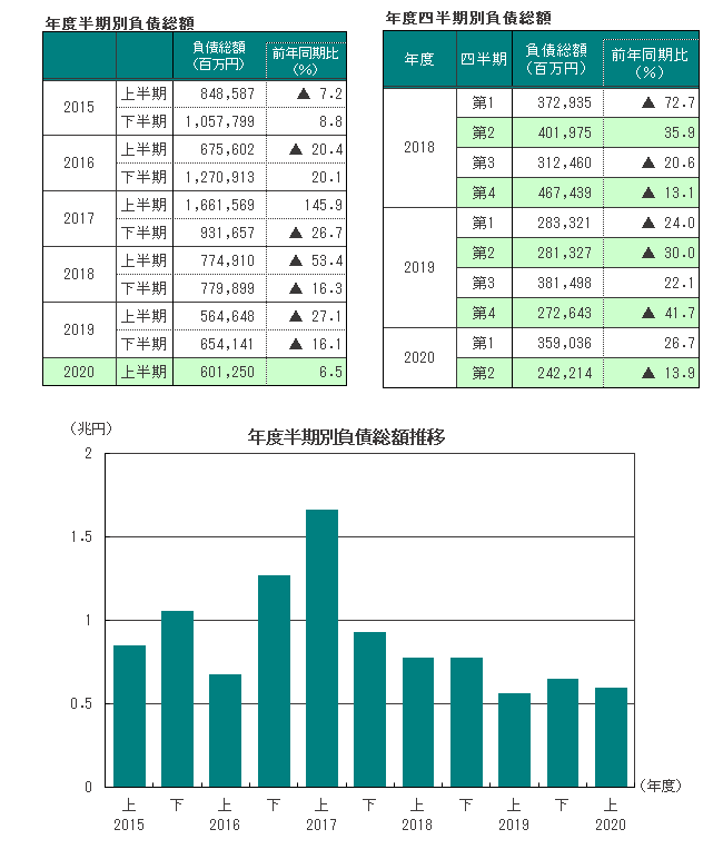 • ■2020年度上半期の負債総額は6012億5000万円(前年同期5646億4800万円、前年同期比6.5%増)と、比較可能な2000年度以降の半期ベースで最小だった前年同期に次ぐ、2番目の低水準