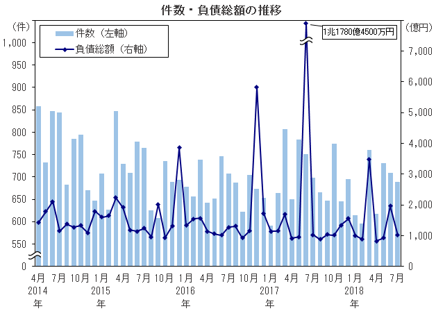 こうした状況下、7月の倒産件数は689件(前年同月比1.3%減)、2018年累計は4718件(前年同期比4.6%減)となっており、当面の倒産動向は抑制された状態で推移すると見込まれる。