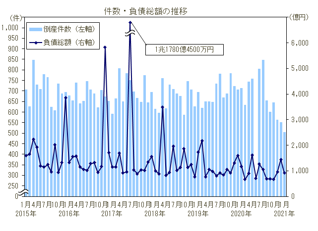 2021年1月の倒産件数(506件、前年同月比29.0%減)は6カ月連続で前年同月を下回り、1月としては2000年1月(354件)に次ぎ2番目の低水準となった。各種給付金や金融機関の特別融資など支援策の効果が持続するなか、全7業種中、不動産を除く6業種が前年同月比で減少、なかでも建設、製造、卸売の3業種は1月では2000年以降最少を記録した。