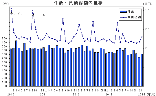 2014年1月の企業倒産は809件となり、2013年最少となった前月(726件)を11.4%上回ったものの、前年同月(854件)を5.3%下回り、6ヵ月連続の前年同月比減少となった。2013年度としては、前月、2013年8月に次ぐ3番目の少なさであり、倒産件数の減少傾向は続いている。
