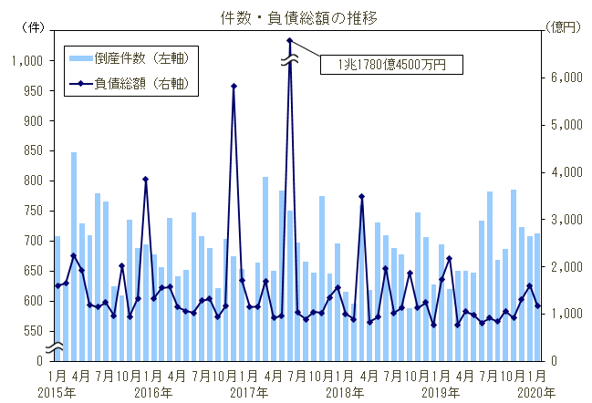 倒産件数は713件、5カ月連続の前年同月比増加