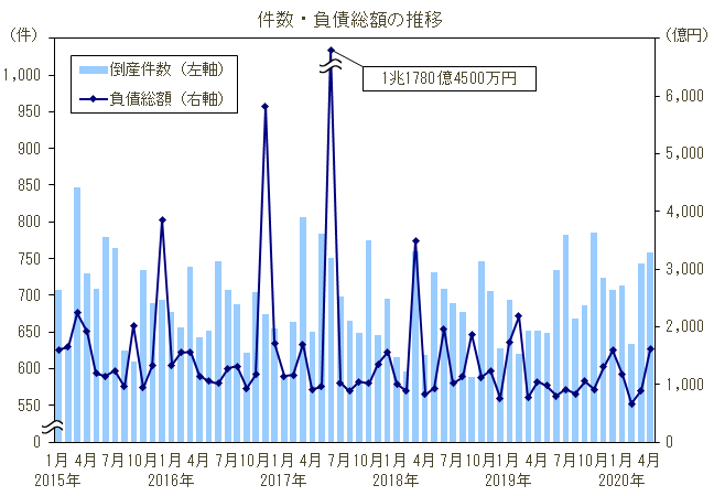2020年4月の倒産件数(758件、前年同月比16.4%増)は8カ月連続の前年同月比増加で、4月としては5年ぶりに700件を上回った。業種別では、消費税率引き上げや新型コロナウイルス感染拡大にともなう売り上げ減少などから、小売業(190件、前年同月比27.5%増)が5カ月連続の増加と、比較可能な2000年以降で4月としての最多を更新し、件数全体を押し上げた。