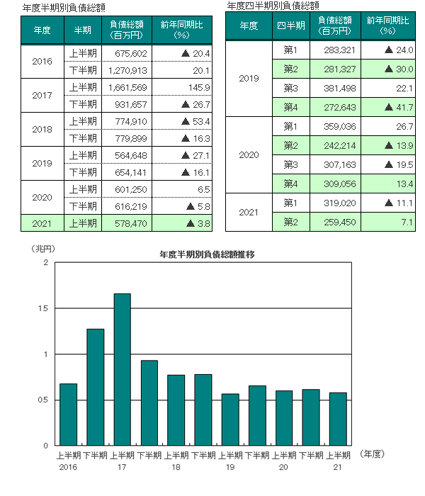 • ■2021年度上半期の負債総額は5784億7000万円と、上半期として2年ぶりの前年同期比減少