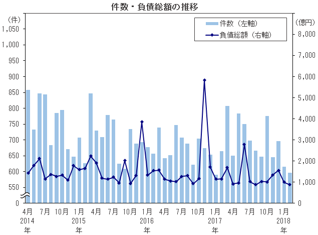 • ■倒産件数は596件(前年同月比10.2%減)で、3カ月ぶりに前年同月を下回り、2017年1月(591件)以来1年1カ月ぶりに600件を下回った。負債総額は887億4600万円(同23.4%減)と、5カ月連続で前年同月を下回り、2000年以降で最小となった