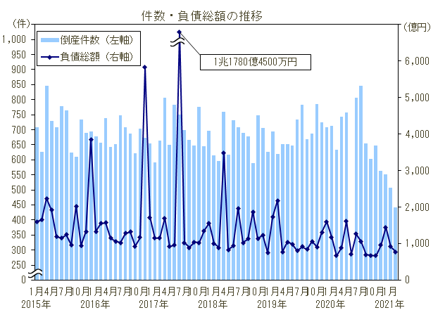 2021年2月の倒産件数(442件、前年同月比30.3%減)は、7カ月連続で前年同月を下回った。金融機関による中小企業への資金繰り支援策などの効果が続くなか、月ベースでは2020年5月(288件)、2000年1月(354件)に次ぐ2000年以降3番目の低水準となった。