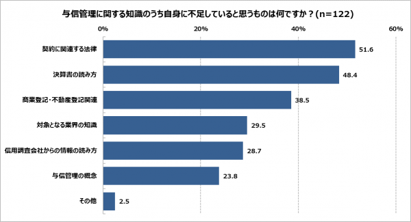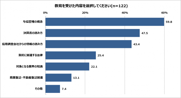 「与信管理の概念」が最も多く59.8%、次に「決算書の読み方」が47.5%、「調査会社の情報の読み方」が43.4%と続きました。最も少なかったのは「商業登記・不動産登記関連」の13.1%でした。