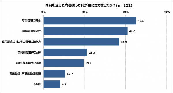「与信管理の概念」が最も多く45.1%、次に「決算書の読み方」41.0%、「調査会社の情報の読み方」が36.9%と、前問の教育を受けた内容と同じ傾向でした。「商業登記・不動産登記関連」が10.7%と最も低い結果となったのも同様でした。