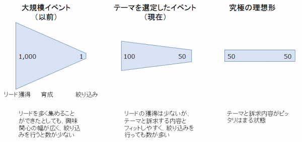 メッセージをお届けする対象のお客様は、企業の業種と人の業務でセグメントを細分化しています。例をあげると、イベント出展です。以前は、大規模な展示会で名刺を集めて、そのリードに対してナーチャリングを行っていました。しかし、テーマのくくりが大きな展示会の場合、名刺を多く集められたとしても、抱えている課題が広すぎて、こちらからのメッセージもぼやけてしまいがちです。そのため、経理財務、マネロン対策などテーマを絞ったイベントを選定しています。大規模イベントで1,000件集めた名刺から見込みが高いお客様が1件よりも、テーマを絞ったもので100件集めて50件にするという考え方です。究極、長方形のファネルが理想ですね(図参照)。