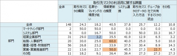 その他では、「名寄せ・マッチングの精度が低い」は全体では18.2%が課題と感じていますが、「経営企画部門」は3.2%と非常に低い結果となりました。取引先マスタのユーザー部門と思われる「総務・人事部門」「審査・経理・財務部門」「営業・営業推進部門」は全体よりも高い結果でした。
