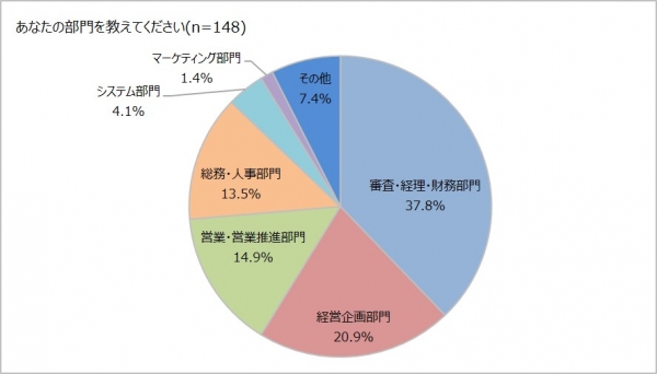 回答者の部門はグラフの通り「審査・経理・財務部門」が37.8%と最多で、「経営企画部門」が20.9%、「営業・営業推進部門」が14.9%と続きました。「その他」の部門としては、購買、生産管理などがありました。